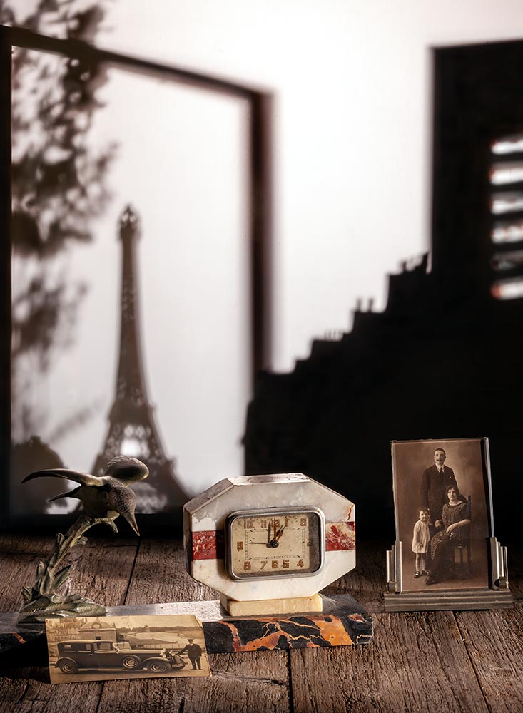 Fenster zum Hof, souvenirs mit Eiffelturm und Art Deko Uhr